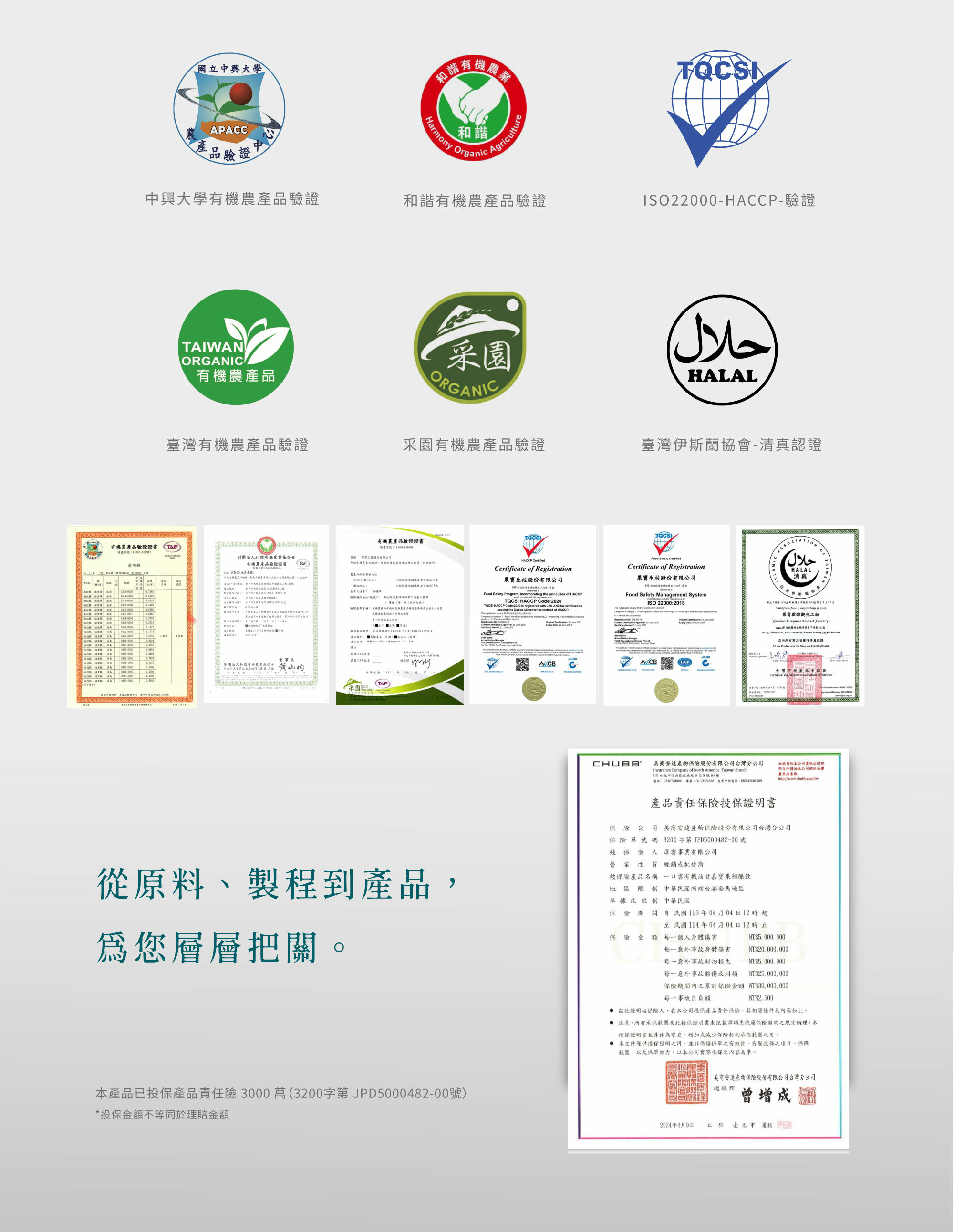 醴厚生醫有機油甘一口飲,通過采園有機產品驗證,以及台灣伊斯蘭協會所頒發的清真認證。在原料、成分、製程、加工人員等均為您層層把關。